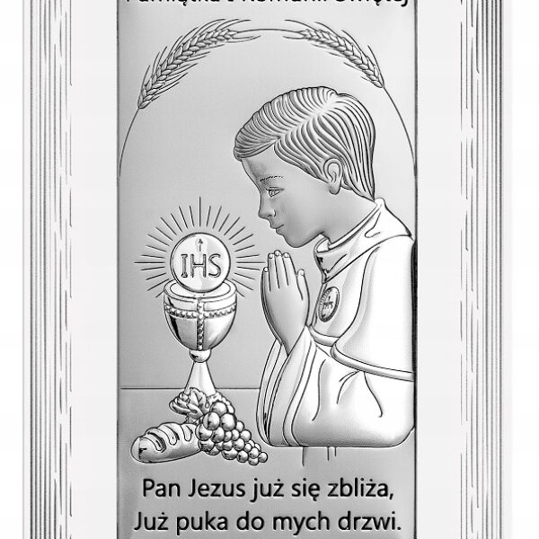 Obrazek Pierwsza Komunia Św. V-6717F/2XO +GRAWER GRATIS! Wymiary obrazka: 15,5 x 25 cm. Obrazek typowo komunijny, przedstawiający modlącego się chłopca. Obrazek jest prostokątny. Wykonany na białym drewnie, z białą ozdobną ramką. Na dole napis "Pan Jezus już się zbliża, już puka do mych drzwi". Ze względu na swoją formę, jak i wymiary najlepiej będzie wyglądał wisząc na ścianie dziecięcego pokoiku. Jeżeli życzą sobie Państwo grawer, taką usługę również posiadamy w swojej ofercie. Obrazek z grawerem, życzeniami jak i dedykacją będzie pamiątką na wiele lat. W jego produkcji wykorzystano innowacyjny metal szlachetny , który zostałpokryty warstwą czystego srebra o próbie 999,95 Drogocenny metal przewyższa jakością materiały pozyskiwane metodami tradycyjnymi. Jest odporniejszy na uszkodzenia mechaniczne i śniedzenie, doskonale odbija światło, co podkreśla szlachetność srebra. Całość została wyprodukowana we Włoszech, zgodnie tradycją obróbki metali szlachetnych. Do obrazka dołączona jest nóżka, aby móc go postawić oraz otwór do powieszenia. Będzie wspaniałym prezentem oraz pamiątką Pierwszej Komunii Świętej.