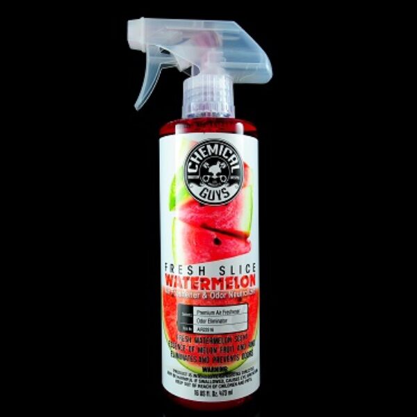 Chemical Guys Fresh Slice Watermelon Scent 473ml Odświeżacz o zapachu świeżo posiekanego arbuza w formie spray-u.Zapach utrzymuje się w samochodzie do 4 tygodni, zdecydowanie dłużej niż tradycyjne odświeżacze.Dodatkowo zawarte w nim enzymy eliminują nieprzyjemne zapachy i redukują ich osadzanie się we wnętrzu. Polecamy rozpylić pod materiałowe dywaniki!Pojemność: 473 ml