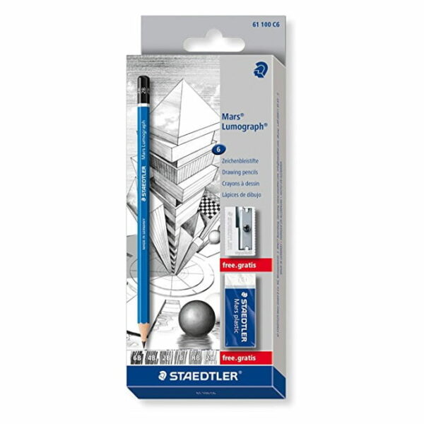 Zestaw zawiera 6 ołówków Mars Lumograph: 2H, HB, B, 2B, 4B, 6B + gumkę i temperówkę Ołówek do pisania, szkicowania i kreślenia Ołówek sześciokątny Średnica grafitu 3.6 mm (6B), 2.5 mm (4B), 2 mm (2B, B, HB, 2H) Odporny na złamania dzięki klejonemu po całej długości grafitowi Lakierowany bez użycia metali ciężkich, nietoksyczny wyprodukowane z cedrowego drewna