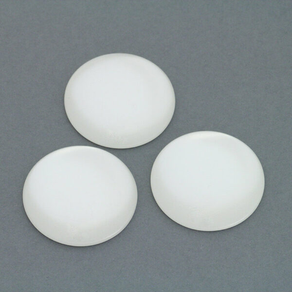 Kaboszony o średnicy 34 mm w kolorze białym z perłowym, księżycowym refleksem. Kaboszony z serii "Luna" mają efektowną głębię, ciekawie odbijają światło. Można je wykorzystać do tworzenia biżuterii sutasz, wkleić w oprawy do zawieszek i kolczyków lub przykleić do płaskich krawatek i sztyftów z talerzykiem.