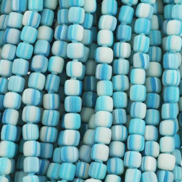 Niebieskie paski koraliki wałki w rozmiarze 6 x 6 mm. Wałki wykonane z soft polimeru- materiału podobnego do modeliny z bardzo miłą powierzchnią w dotyku. Sznurek 40 cm to około 66 koralików.