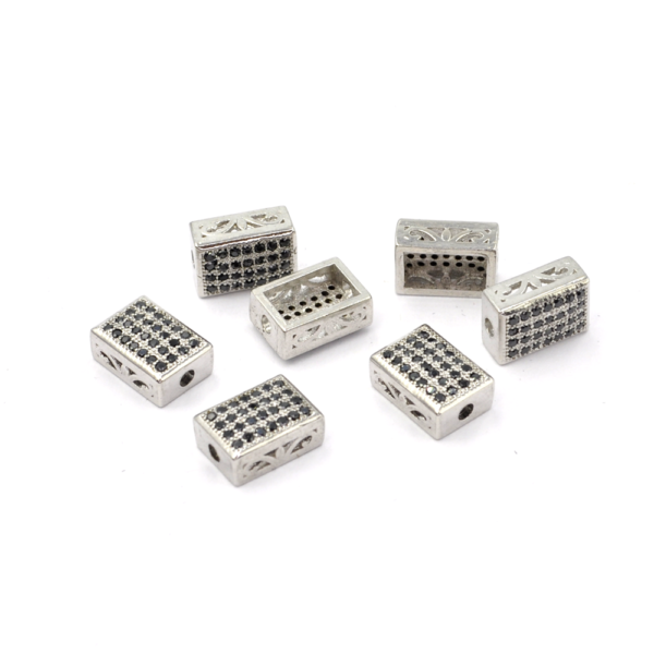 Surowiec: Metal Kształt: Prostopadłościan Rozmiar: 10 x 7 x 5 mm Średnica otworu: ok. 1 mm (otwór w krótszych bokach) Przekładka lekka, ażurowa, zdobiona cyrkoniami. Rzemień nie jest obiektem sprzedaży, służy tylko do prezentacji przekładki.