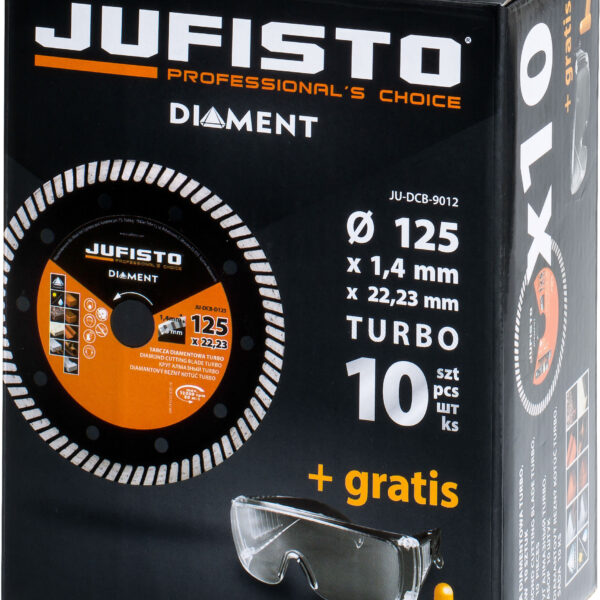 Tarcza diamentowa super cienka 1.4mm, gat. diamentu "A", wysokość segmentu 8mm, otwór 22.23 mm.Tarcza diamentowa przeznaczona do cięcia ceramiki, betonu, gresu, kamienia, marmuru, klinkieru, cegły, piaskowca.(przy twardych materiałach należy używać chłodzenia).Cechuje się mniejszym zużyciem energii, mniejsza ilością kurzu, hałasu, iskier i mniej straty materiału.10% taniej niż przy zakupie pojedynczym. Dodatkowo okulary i stopery do uszu zupełnie gratis.DANE TECHNICZNEProducent: JufistoStan: NowyTyp: ZestawRozmiar: 125x 1,4 mmIlość w zestawie: 10 sztWysokość segmentu: 8 mm