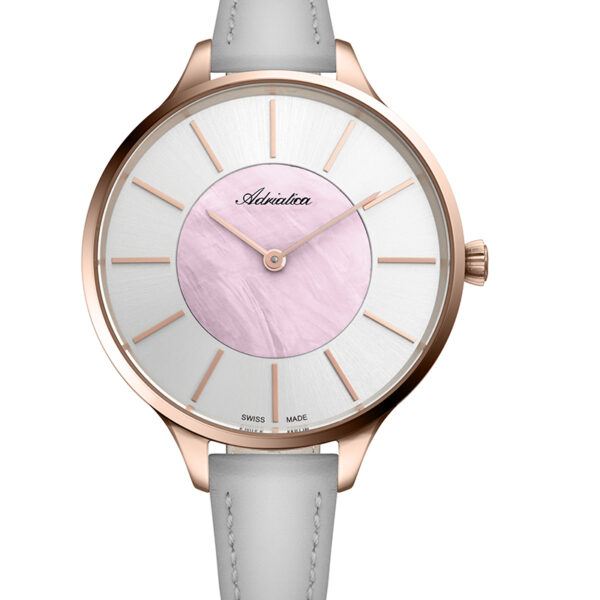 Rodzaj zegarka: DamskiPasek / bransoleta: PasekMechanizm: KwarcowyFunkcje: BrakKształt koperty: OkrągłaKolor tarczy: RóżowyKolor paska: SzaryKolor koperty: Różowe złotoOpis tarczy: IndeksyMateriał wykonania: Stal szlachetnaWodoszczelność: 3 ATMSzkło: MineralneKamienie: Bez kamieni