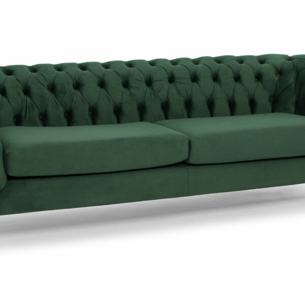 Nowoczesna kanapa w stylu glamour Chesterfield w odcieniu butelkowej zielni. Zielona sofa do salonu z gustownymi ręcznymi pikowaniami. Sofa trzyosobowa na wysokich nóżkach i bardzo wygodnym profilowanym oparciem.