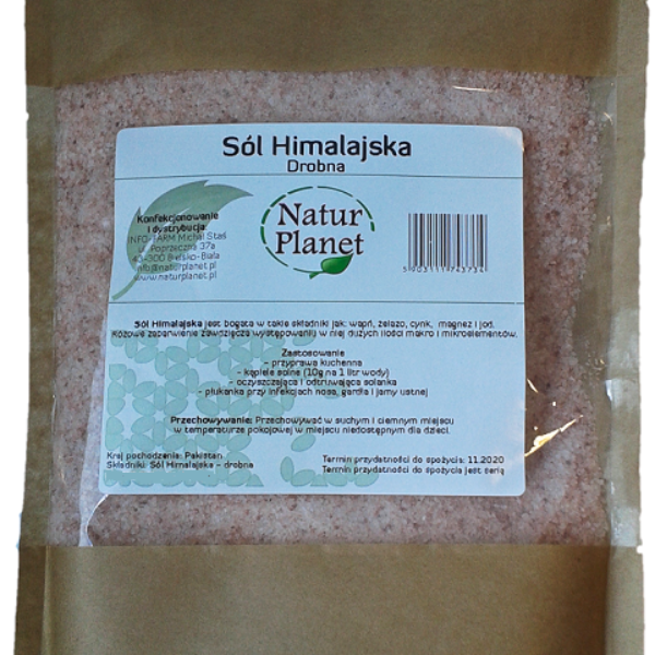 Natur Planet Sól Himalajska Drobna 1kg Nieprzetworzona w procesie produkcji. Wydobywana ręcznie, w tradycyjny sposób (tzn. przez płukanie i suszenie). Osiadająca na dnie oceanicznym sól, została pokryta lawą oraz wieczną zmarzliną, co pozwoliło przetrwać jej w niezmienionej formie, aż do dzisiejszych czasów. Dzięki tej naturalnej ochronie i brakiem kontaktu z zanieczyszczeniami, różowa sól himalajska jest najczystszą, jaką możemy spotkać na ziemi. Różowa sól himalajska zawiera spektrum 84 minerałów oraz innych pierwiastków, których na próżno szukać w soli tradycyjnej. Tak duża różnorodność kolorystyczna kryształków soli himalajskiej (od licznych odcieni bieli, przez róż, aż po czerwień), jest wynikiem właśnie tego niezwykłego bogactwa mineralnego, a w szczególności żelaza. W przeszło 85% składa się ona z roztworu chlorku sodu i w niespełna 15% z innych minerałów, w tym m. in. węgla, wodoru, litu, tlenu, azotu, fluoru, sodu, krzemu, magnezu, wapnia, siarki, wspomnianego już wcześniej żelaza, chromu, manganu, cynku, jodu oraz wielu innych. Różowa sól himalajska, wspomaga utrzymanie równowagi i harmonii w naszym organizmie. Stosuje się ją nie tylko jako zamiennik soli spożywczej, ale także jako składnik solanek do zabiegów zdrowotnych i kosmetycznych. Jest to substancja, która znalazła zastosowanie w kąpielach odmładzających, regenerujących. Zastosowanie: Różową sól himalajską możemy stosować na kilka podstawowych sposobów: Jako alternatywa dla tradycyjnej soli kuchennej . Jako solankę odtruwającą nasz organizm. Do 250 ml wody dodaj 1 łyżkę roztworu nasyconego soli himalajskiej (w celu uzyskania roztworu nasyconego, do ciepłej wody wsyp sól i mieszamy, aby się rozpuściła. Dosypujemy sól do wody aż do momentu, gdy przestanie się ona rozpuszczać). Zaleca się picie jednej szklanki dziennie. Jako dodatek do kąpieli solankowych. Jest to doskonały sposób na regenerację mięśni po wysiłku fizycznym. Do wanny z ciepłą wodą (temperatura ok. 37 stopni C) wlej roztwór soli himalajskiej (1 kg soli na 4 litry wody). Kąpiel taka powinna trwać maksymalnie 30 minut. Osoby u których występują problemy z krążeniem, powinny wcześniej skonsultować się z lekarzem, czy mogą korzystać z takich kąpieli!!! Jako składnik roztworów do płukanek solankowych (do 1 szklanki wody dodaj 1 łyżkę stołową soli). Roztwór z soli himalajskiej można dodawać do domowych maseczek, a samą sól zmieszaną z oliwą lub olejem kokosowym możemy stosować jako peeling do twarzy i ciała.