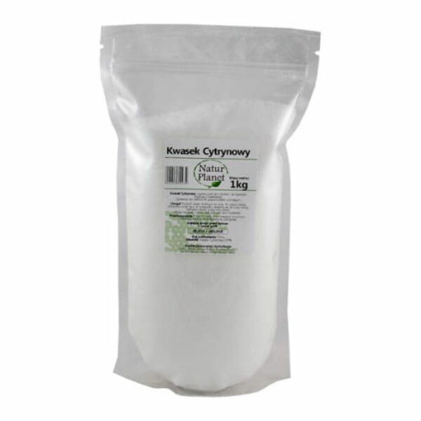 Natur Planet Kwasek Cytrynowy 100%Opakowanie: 1 kg doypackPosiada szereg zastosowań w przemyśle spożywczym, kosmetycznym, oraz farmaceutycznym.Właściwości przeciwutleniające kwasu cytrynowego wykorzystuje się w procesie konserwacji większości środków spożywczych, jak również kosmetyków. Warunki przechowywania:W suchym, chłodnym i wolnym od obcych zapachów miejscu. Chronić przed światłem. Kwasek cytrynowy ma świetne zastosowanie jako środek do czyszczenia różnego rodzaju sprzętów bądź tkanin w gospodarstwie domowym np.: jako odkamieniacz czajników lub innych sprzętów narażonych na osadzanie się kamienia – E330 jest bardzo częstym składnikiem środków do usuwania niechcianych osadów. Tego rodzaju preparatu wcale nie trzeba kupować. Można go zrobić samodzielnie. Wystarczy jedną torebkę kwasku cytrynowego wsypać do szklanki wody i wlać do naczynia. Czajnik musi być włączony, ponieważ roztwór trzeba zagotować, a następnie odczekać około 10 minut na usunięcie kamienia. Po użyciu kwasku cytrynowego czajnik należy dokładnie wypłukać; kwasek cytrynowy to skuteczny wzmacniacz proszku do prania, zwłaszcza do białych tkanin. Nie tylko usuwa plamy, ale także wybiela. Można go dodać, gdy chcemy, aby nasze firany zyskały biały kolor po długim pobycie w szafie. do usuwania osadów – E330 bez problemu usuwa osady powstałe po kawie lub herbacie. Aby go użyć do tego celu, nie ma konieczności sporządzania roztworu. Jedną niewielką łyżeczkę kwasku należy nasypać na powierzchnię gąbki do mycia i powolnymi ruchami wyszorować naczynie; do czyszczenia armatury z zacieków – do usuwania brudu z tego rodzaju sprzętów wykorzystuje się pastę z kwasku cytrynowego. Powstaje ona na skutek wymieszania jednej torebki kwasku z niewielką ilością wody; do nabłyszczania sztućców i naczyń po umyciu – żeby ładnie wyglądały, trzeba je wymoczyć w roztworze dwóch łyżeczek kwasku cytrynowego i wody. Płynu można użyć także do wyczyszczenia zmywarki. Kwaskiem cytrynowym można przedłużać świeżość owoców. Wystarczy je spryskać uprzednio sporządzonym roztworem. Niektóre osoby wykorzystują go do usuwania nieprzyjemnych zapachów lub odbarwienia skóry po obranych owocach czy warzywach. Zdarza się, że konsumenci dodają kwasek cytrynowy do basenu, ponieważ ma on właściwości bakteriobójcze.