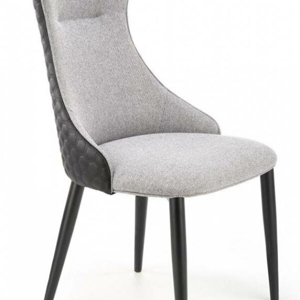 Stalowe nogi w kolorze czarnym, obicie wykonane z wysokiej jakości tkaniny, tył powleczony eco skórą, stanowić będzie eleganckie uzupełnienie wystroju salonu lub jadalni