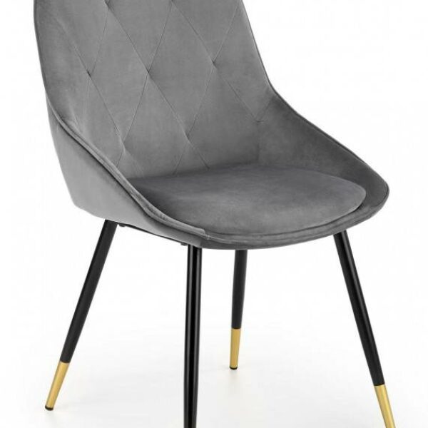 Stalowe nogi w kolorze czarno złotym, obicie wykonane z wysokiej jakości welurowej tkaniny, stanowić będzie eleganckie uzupełnienie wystroju salonu lub jadalni