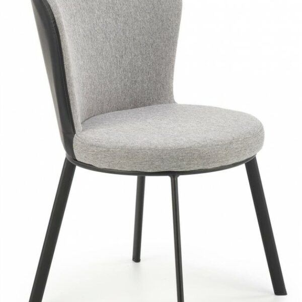 Stalowe nogi w kolorze czarnym, obicie wykonane z wysokiej jakości tkaniny, tył powleczony eco skórą, stanowić będzie eleganckie uzupełnienie wystroju salonu lub jadalni