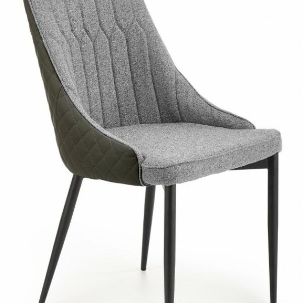 Stalowe nogi w kolorze czarnym, obicie wykonane z wysokiej jakości tkaniny, tył powleczony eco skórą, stanowić będzie eleganckie uzupełnienie wystroju salonu lub jadalni