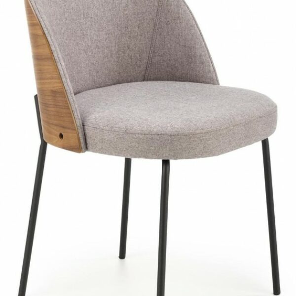 Stalowe nogi lakierowane na czarno, obicie wykonane z wysokiej jakości tkaniny, tył pokryty okleiną w kolorze jasny orzech, stanowić będzie eleganckie uzupełnienie wystroju salonu lub jadaln