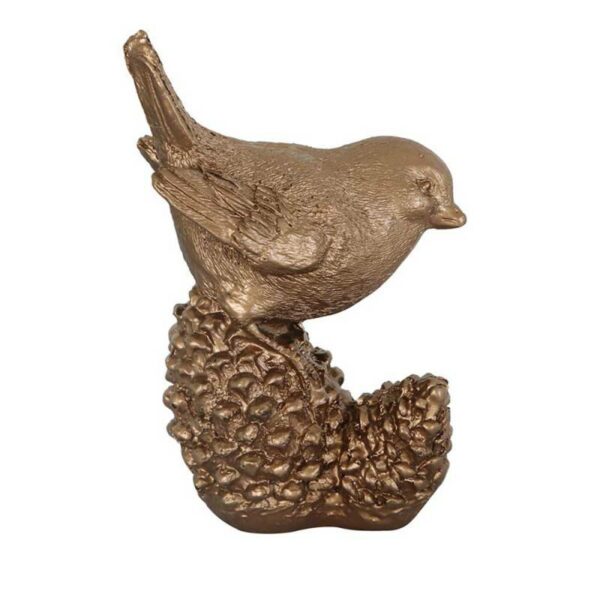 Wykonany z poliresinu, dekoracyjna figurka ptaszka z szyszką, idealna do dekoracji wnętrz, na kominek, parapet okienny, do ogrodu, czy na taras o wymiarach: 11x8 cm