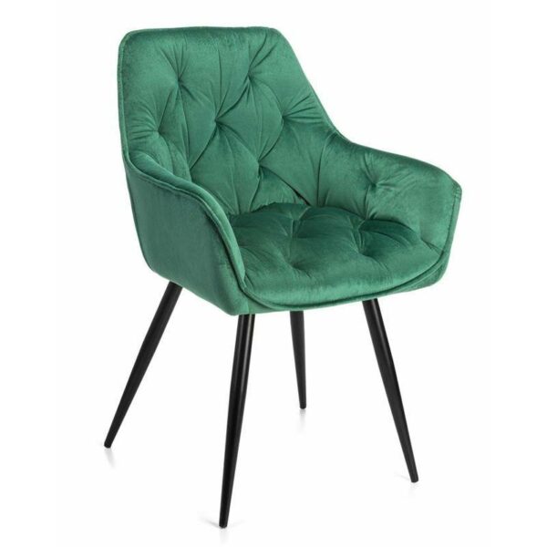 Wykonane z aksamitnego, przyjemnego w dotyku materiału w zielonym odcieniu, nogi wykonane z metalu w kolorze czarnym