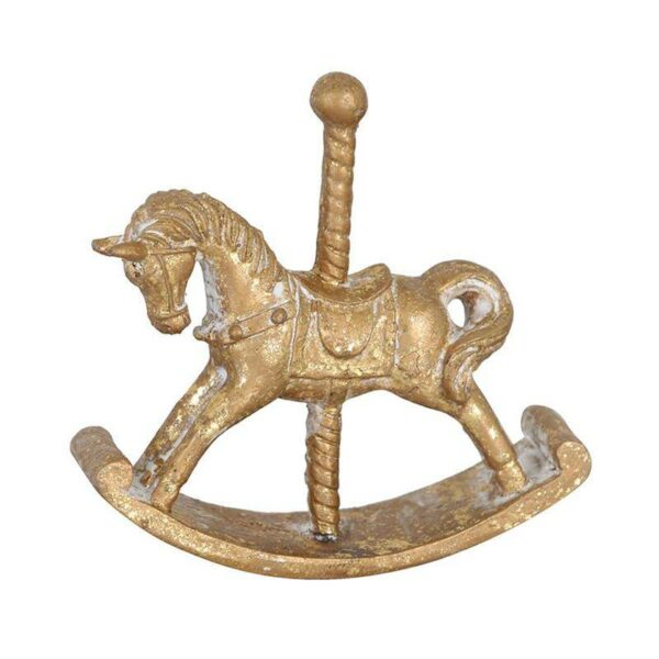Wykonany z poliresinu w stylu Vintage w kolorze postarzanego złota, dekoracyjny koń na biegunach, idealny do dekoracji wnętrz o wymiarach: 10x2.5x10 cm
