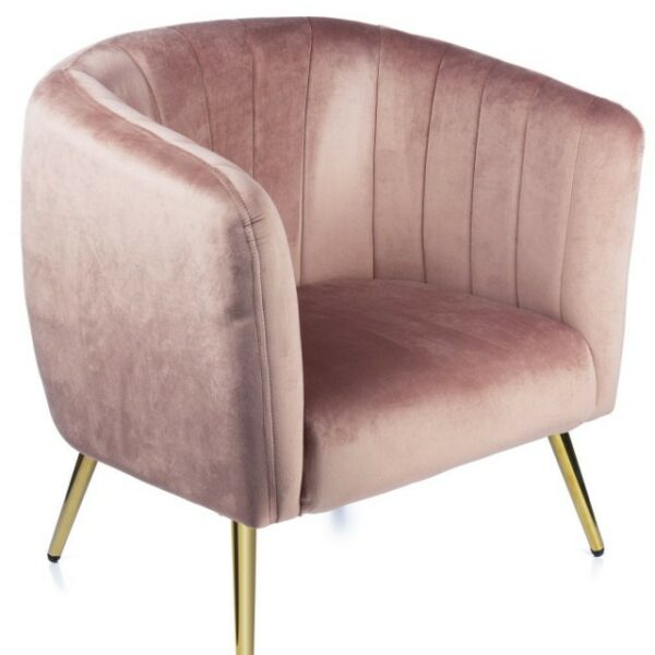 Wygodny fotel wykonany z przyjemnej w dotyku tkaniny w kolorze łososiowym, posiada metalowe, regulowane nóżki w kolorze czarnym