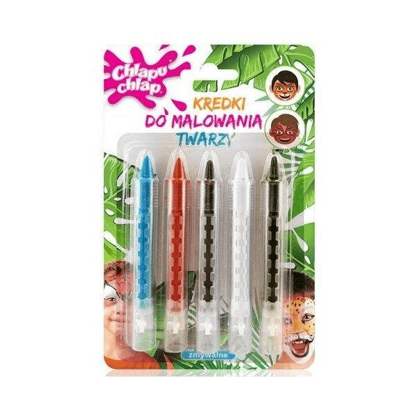 Chlapu Chlap Kredki Do Malowania Twarzy Chłopiec 4 Sztuki Malują uśmiech od ucha do ucha! Super frajda dla małych i dużych dzieci. Wystarczy odrobina fantazji aby dziecięce buźki zmienić w kolorowe zwierzaki i stworki - kotki, pieski, tygryski, panterki, motylki, biedronki, ślimaczki lub stworzyć bajkowe postacie księżniczek, wróżek, syrenek. Wspólny czas zmień w super przygodę, która bawi i rozwija. Rysunek jest łatwo zmywalny poprzez użycie ciepłej wody z mydłem. Ciemniejszy kolor najlepiej stosować do konturów.miękkie, łatwo się rozprowadzająhipoalergiczneprecyzyjnie pokrywają skóręmożna je temperowaćKolory kredek: niebieska, czerwona, brązowa, biała, khaki