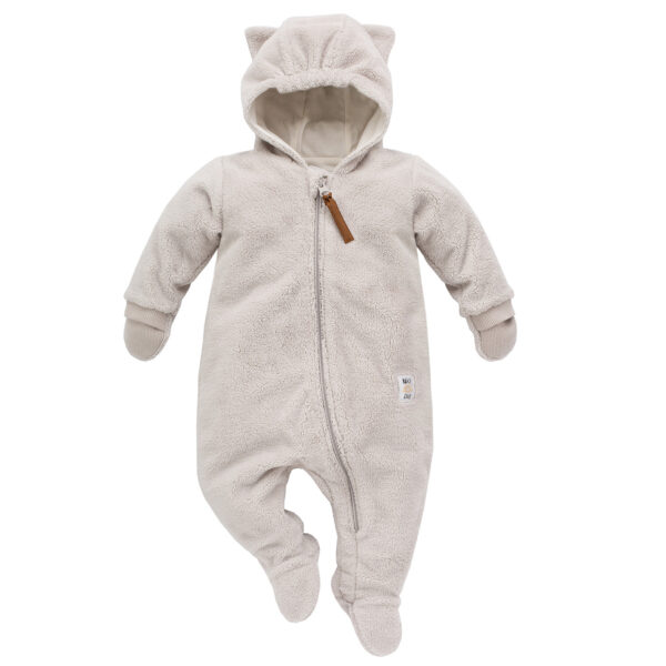 Beżowy kombinezon niemowlęcy wykonany z przyjemnej w dotyku tkaniny imitującej futerko lamy. Kaptur ma urocze, ozdobne uszy. Od wewnątrz kombinezon ma gładką, bawełnianą podszewkę w kolorze ecru. Rękawy wykończyliśmy ściągaczem i rękawiczkami-łapkami, które chronią dłonie maluszka przed chłodem. Z przodu po lewej stronie umieściliśmy naszywkę z napisem Nice Day. Kombinezon ma wszyty długi suwak na całej długości, co bardzo ułatwia młodym rodzicom rozbieranie i ubieranie maluszka. Świetnie sprawdzi się na jesienne i wiosenne spacery. Warto o nim pamiętać kompletując wyprawkę dla swojego dziecka.Materiał: 100% poliester, podszewka: 100% bawełna.Instrukcja prania: max. 40°C