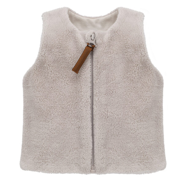 Beżowa kamizelka z miłej w dotyku tkaniny, imitującej futerko lamy oraz gładką podszewką w kolorze ecru. Z przodu po lewej stronie umieściliśmy naszywkę z liskiem. Kamizelka zapinana jest na całej długości na wygodny suwak, co bardzo ułatwia ubieranie malucha. Luźny fason nie krępuje ruchów dziecka i zapewnia mu komfort podczas codziennych aktywności. Kamizelka sprawdzi się, gdy jest za ciepło na kurtkę, ale już za zimno na samą bluzeczkę. Można jej też używać jako tymczasowe ubranko przy zmieniającej się temperaturze w czasie podróży samochodem. Kamizelka stworzy ciekawe zestawy z pozostałymi ubrankami z kolekcji Nice Day.Materiał: 100% poliester, podszewka: 100% bawełna.Instrukcja prania: max. 40°C