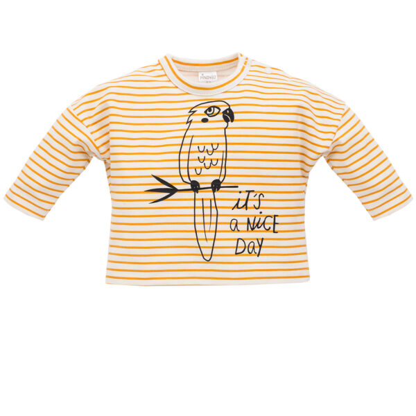 Bluzka dziecięce z długim rękawem w paski w kolorze ecru i curry oraz ozdobnym nadrukiem papugi z przodu. Metoda farb wodnych sprawia, że nadruki są bezpieczne i trwałe. To model bluzki z obniżoną linią ramion, który jest bardzo modny w tym sezonie. Dla ułatwienia ubierania dziecka, na lewym ramieniu umieściliśmy wygodne, bezniklowe zatrzaski. Bluzkę możesz łączyć na wiele sposobów z innymi ubrankami z kolekcji Nice Day.Skład: bawełna 95%, elastan 5%.Instrukcja prania: max. 40°C