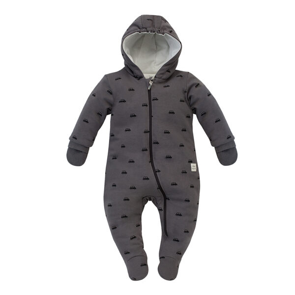 Grafitowy trójwarstwowy kombinezon niemowlęcy we wzór samochodzików w stylu retro, wykonany bezpieczną i trwałą metodą farb wodnych. Po lewej stronie na wysokości bioder umieściliśmy ozdobną naszywkę z napisem I LIKE MY CAR. Kombinezon wypełniony jest ociepliną, a od wewnątrz ma gładką podszewkę w kolorze ecru, ze 100% bawełny. Rękawy wykończyliśmy ściągaczem i rękawiczkami-łapkami, które doskonale chronią dłonie maluszka przed chłodem. Kombinezon ma wszyty długi suwak na całej długości. To doskonałe rozwiązanie dla młodych rodziców, które ułatwia rozbieranie i ubierania dziecka. Wszyte nad piętkami gumki uniemożliwiają wysuwanie się stópek dziecka z nogawek. Kombinezon świetnie sprawdzi się na jesienne i wiosenne spacery. Warto o nim pamiętać kompletując wyprawkę niemowlęcą. Skład: 100% bawełna.