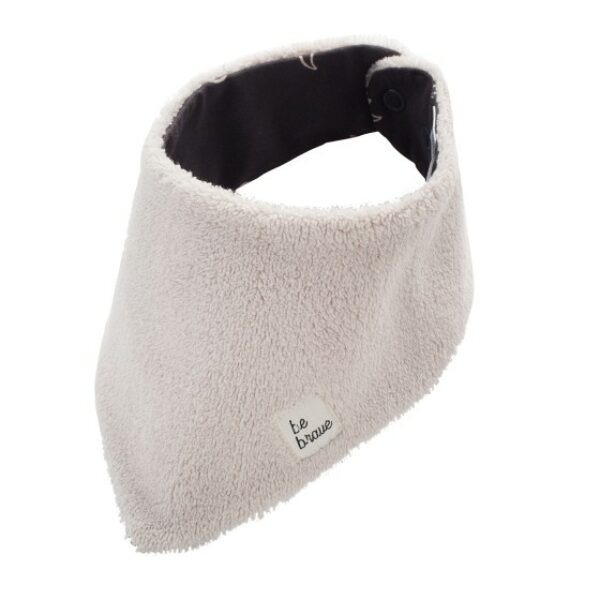 Modna, dwuwarstwowa chustka zimowa Winter nie tylko doskonale chroni szyję przed chłodem. To również świetny dodatek w garderobie maluszka, który uzupełni wszystkie jesienno-zimowe stylizacje. Z jednej strony jest beżowe, przyjemne w dotyku futerko, które imituje futro lamy, z drugiej to bawełna z dodatkiem elastanu w uroczy wzór księżyców na grafitowym tle. Z przodu po lewej stronie umieściliśmy małą, ozdobną naszywkę z napisem „Be Brave”, która stylem nawiązuje do kolekcji Dreamer. Nasza chustka to świetna alternatywa dla tradycyjnego szalika. Zapinana jest na wygodne zatrzaski, dzięki czemu będziesz mieć pewność, że nie zsunie się z szyi nawet bardzo ruchliwego dziecka. Warto o niej pamiętać kompletując wyprawkę dla swojego maluszka.Skład: 100% poliester, podszewka: 95% bawełna, 5% poliester.