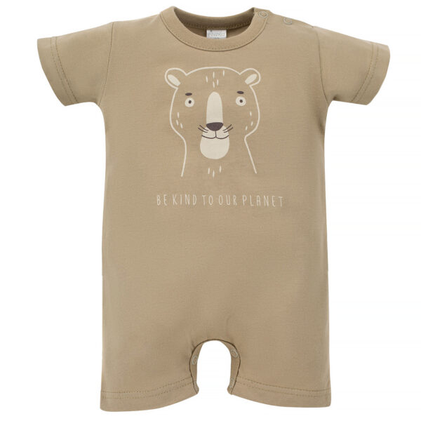Rampers niemowlęcy z krótkim rękawem, w kolekcji Free Soul uszyty został z delikatnej bawełny w kolorze zielonym. Umieszczony na przodzie nadruk wesołej pantery i napisu „BE KIND TO OUR PLANET”, nawiązuje do unikatowego charakteru kolekcji. Rampers niemowlęcy to niezbędny element letniej wyprawki noworodka. Wyprodukowane jest w Polsce oraz posiada certyfikat „Bezpieczny dla dziecka".uszyty w 100% z bawełnynadruk wykonany bezpieczną metodą farb wodnych, odpornych na codzienne użytkowanie i praniedelikatne wykończenie szyjki sprawia, że maluch czuje się w ubranku komfortowo i jednocześnie wygląda przepiękniedla ułatwienia ubierania i przewijania, rozpinany na lewym ramionku i w kroku na bezpieczne, bezniklowe zatrzaskina zdjęciu model ma 80 cm wzrostu i nosi rozmiar 80Prać mechaniczne w temp. do 40°C. Nie stosować bielenia. Można suszyć w suszarce bębnowej. Prasować po lewej stronie w temp. do 200° C. Nie czyścić chemicznie.