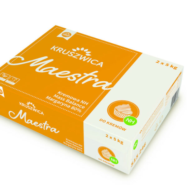 Wysokiej jakości margaryna o 80% zawartości tłuszczu, posiadająca delikatną barwę oraz wyjątkowy smak i zapach, który świetnie komponuje się z dodatkami mlecznymi. Przeznaczona szczególnie do przygotowywania doskonałych kremów, mas cukierniczych, deserów i nadzień, charakteryzujących się wyjątkową puszystością i delikatnością. Produkt bez transowy – nie zwiera tłuszczów utwardzonych.Margaryna Maestra posiada wyjątkowe właściwości smakowo-zapachowe i świetnie komponuje się z innymi składnikami. Zapewnia stabilną konsystencję kremu oraz bardzo dobre napowietrzanie kremowej masy. Produkt nie zawiera tłuszczów utwardzonych.Skład: oleje roślinne (palmowe, rzepakowy, kokosowy), w zmiennych proporcjach, woda, emulgatory (mono-i diglicerydy, kwasów tłuszczowych, estry kwasów tłuszczowych i poliglicerolu, lecytyny), sól (0,3%), regulator kwasowości (kwas cytrynowy), naturalny aromat, barwnik (annato).Tłuszcz: 80% ± 0,5 %