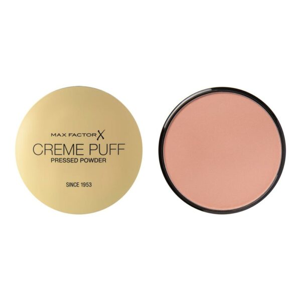Max Factor Creme Puff Puder Prasowany 59 Gay Whisper Max Factor Creme Puff Puder Prasowany to zupełny klasyk marki Max Factor.Posiada ponadczasową formułę 2 in 1 został po raz pierwszy wprowadzony na rynek w 1953 roku i okazał się totalnym hitem aż po dziś dzień. Produkt łączy w sobie podkład w kremie oraz sypki puder. Puder zapewnia idealne krycie, nie powoduje uczucia ciężkości ani efektu maski. Zawiera ochronne filtry, które chronią cerę przed niezdrowym promieniowaniem UVA/UVB.Kosmetyk z nowej wersji produkcyjnej - nie posiada gąbeczki i folii.Odcień: 59 Gay WhisperPuder zastosowany na mokro może służyć jako podkład. Pojemność: 14g