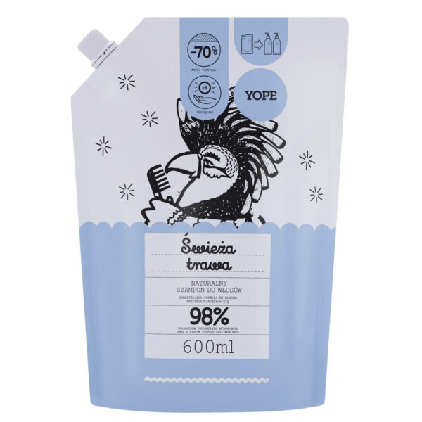 YOPE Naturalny Szampon do Włosów Świeża Trawa 600mlDelikatny, naturalny szampon przeznaczony do mycia pielęgnacji włosów przetłuszczających się.Formuła produktu opiera się w 98% na składnikach pochodzenia naturalnego.W składzie szamponu znajdziemy ekstrakty z lukrecji, trawy cytrynowej i limonki, miąższ z aloesu.Szampon reguluje wydzielanie sebum i dba o kondycję skóry głowy. Produkt skutecznie tonizuje i odświeża skórę dzięki czemu zapobiega nadmiernemu przetłuszczaniu się włosów. Produkt posiada przyjemny, rześki, orzeźwiający zapach trawy. Pojemność: 600ml - uzupełnienieSposób użycia: Nałóż szampon na wilgotne włosy. Dokładnie spłucz wodą.