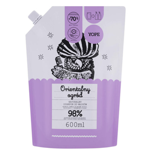 YOPE Naturalny szampon do Włosów Orientalny Ogród Delikatny, naturalny szampon przeznaczony do mycia i pielęgnacji włosów suchych, zniszczonych i pozbawionych blasku.Formuła produktu opiera się w 98% na składnikach pochodzenia naturalnego.W składzie szamponu znajdziemy olej arganowy, masło shea, ekstrakty z róży, wanilii oraz drzewa sandałowego.Szampon nawilża włosy, chroni przed łamaniem, ułatwia rozczesywanie, nadaje blasku i elastyczności. Olej arganowy i masło shea wpływają na intensywnie i dogłębne nawilżenie włosów. Produkt posiada przyjemny aromat kwiatowo-drzewnej mieszanki.Pojemność: 600ml - uzupełnienieSposób użycia: Nałóż szampon na wilgotne włosy. Dokładnie spłucz wodą.