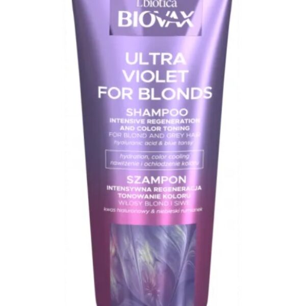 Biovax Ultra Violet For Blonds Szampon do Włosów Blond 200mlSzampon do włosów z serii Ultra Violet Blonds. Produkt stworzony został z myślą o włosach rozjaśnianych, blond i z pasemkami. Dba o odpowiedni ich odcień, minimalizuje żółte, niechciane pigmenty. Odświeża kolor blond i neutralizuje ciepłe tony. Oczyszcza włosy i skórę głowy.Wzbogacony kwasem hialuronowym i olejkami, które pielęgnują włosy.Pozostawia włosy nawilżone i miękkie. Pojemność: 200mlSeria: Ultra Violet For Blonds