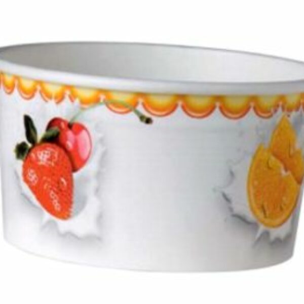 Kubek na lody wykonany z papieru nieprzemakalnego. Wzór - owoce. Pojemność kubka - 70 ml.