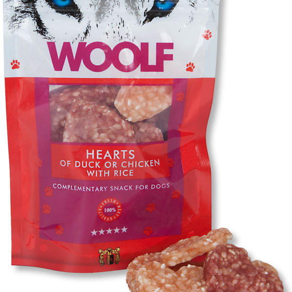 *Woolf Hearts of Duck or Chicken with Rice* to naturalny przysmak dla psa o bardzo dużej zawartości mięsa z kurczaka i kaczki z ryżem. Doskonale nadaje się jako przekąska, nagroda oraz przysmak szkoleniowy. Nie zawiera dodatków chemicznych, barwników oraz konserwantów.