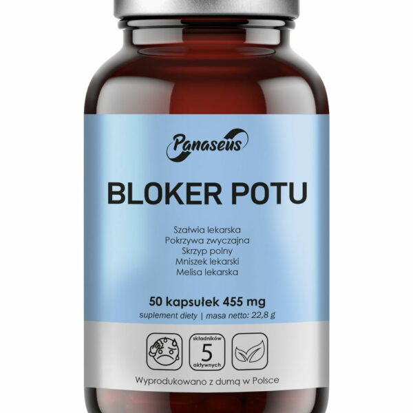 Szybki i naturalny Bloker Potu dla każdego Nadmierna potliwość to problem, który może dotknąć osoby w każdym wieku. Zwykle jest on bardzo uciążliwy, niekiedy nawet wstydliwy. Istnieje wiele naturalnych metod, które pozwalają na ograniczenie nadmiernej potliwości. Jak to skutecznie zrobić? Poznaj nasz niesamowity Bloker Potu, dzięki któremu w prosty sposób poprawisz komfort swojego życia. Sprawdź go już teraz! Stosowanie wyselekcjonowanych i odpowiednio skomponowanych ziół może w łatwy sposób pomóc Ci w rozwiązaniu Twoich wielu problemów ze zdrowiem. Zespół technologów Panaseus opracował skuteczną kompozycję naturalnych ekstraktów z ziół. Wykazują one działanie, które może znacznie ograniczać nadmierne wydzielanie potu. Już teraz warto z skorzystać z naszego blokera i cieszyć się nieskrępowanym działaniem w każdej sytuacji. Bloker Potu - Twoje naturalne wsparcie swojego organizmu Naturalne składniki aktywne mogą przyczyniać się do łatwego zmniejszenia skutków nadpotliwości. Szałwia lekarska, Skrzyp polny, Mniszek lekarski, Melisa lekarska czy Pokrzywa zwyczajna stanowią pełny skład naszego doskonałego Blokera Potu. To właśnie one mogą mieć bardzo skuteczny i pozytywny wpływ na rozwiązanie Twoich problemów z nadpotliwością. W ten sposób prawdopodobnie łatwo zapomnisz o wstydliwej i męczącej dolegliwości. Wystarczy wziąć po śniadaniu jedną kapsułkę dziennie, a następnie popić ją wodą. Problemy z potliwością należy wspierać poprzez działanie do wewnątrz organizmu, dzięki czemu można o wiele szybciej otrzymać pożądany skutek ich rozwiązania. Nasz Bloker Potu jest całkowcie bezpieczny dla Twojego zdrowia, ponieważ nie zawiera metali ciężkich, takich jak: arsen, kadm, ołów czy rtęć. Możesz być zaskoczony efektem działania tego produktu. Dzięki wsparciu Twojej prawidłowej potliwości, masz możliwość łatwego i szybkiego uzyskania wymiernych efektów. Zapraszamy Cię do skorzystania z wyjątkowego działania naszego Blokera Potu. Wiemy, że może on Ci znacznie pomóc rozwiązać swoje problemy z nadpotliwością. Życzymy Ci wyłącznie udanych zakupów w naszym sklepie online! Składnik aktywny 1 kapsułka Szałwia lekarska - ekstrakt 20:1 250 mg Pokrzywa zwyczajna - ekstrakt 20:1 50 mg Skrzyp polny - ekstrakt 29 mg w tym krzemionka (7%) 2 mg Mniszek lekarski - ekstrakt 10:1 18 mg Melisa lekarska - ekstrakt 10:1 18 mg Zalecane dawkowanie: 1 kapsułki raz dziennie. Sposób użycia: Kapsułkę połknąć i popić dużą ilością wody, po pierwszym posiłku.Skład: Ekstrakt z liści szałwii lekarskiej (Salvia officinalis) 20:1, ekstrakt z liści pokrzywy zwyczajnej (Urtica dioica) 20:1, ekstrakt z ziela skrzypu polnego (Equisetum arvense) standaryzowany na zawartość 7% krzemionki, ekstrakt z korzenia mniszka lekarskiego (Taraxacum officinale) 10:1, ekstrakt z liści melisy lekarskiej (Melissa officinalis) 10:1. Skład kapsułki: Celuloza roślinna (wegetariańskie) Informacja: Nie przekraczać zalecanej dziennej porcji. Suplement diety nie może być stosowany jako substytut zróżnicowanej diety i zdrowego trybu życia. Przechowywać w suchym i ciemnym miejscu w temperaturze pokojowej, w sposób niedostępny dla małych dzieci. Podmiot odpowiedzialny: SSL Sp. z o.o., ul. Granitowa 3/14, 02-681 Warszawa Masa netto: 22,8 g Ostrzeżenie: Osoby przyjmujące leki, przed użyciem powinny skonsultować się z lekarzem lub farmaceutą. Niewskazane dzieciom, kobietom w ciąży oraz karmiącym. Produkt wolny od metali ciężkich, takich jak arsen, kadm, ołów czy rtęć.