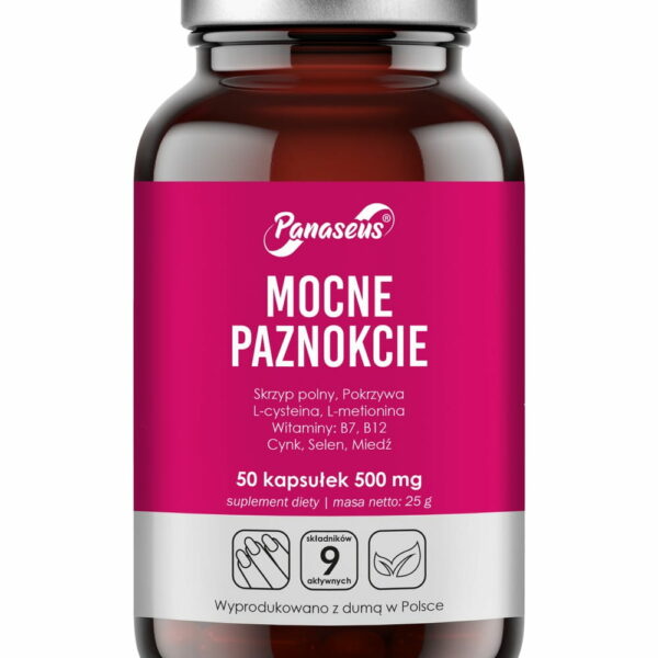 Mocne paznokcie - 50 kapsułek - Panaseus CZYM SĄ PAZNOKCIE? Najprościej mówiąc, paznokieć to płytka stwardniałych komórek wyrastająca u końców palców u rąk i nóg. Jednak widoczna część paznokcia to jedynie „wierzchołek góry lodowej”. Nasze paznokcie skrywają dużo więcej, niż na pozór mogłoby się wydawać. Ich stan może być na przykład odbiciem naszego poziomu nawodnienia, a nawet ogólnego zdrowia organizmu. Chcesz wzmocnić swoje paznokcie? Nim sięgniesz po naturalne wsparcie w postaci diety i suplementacji, warto zrozumieć w jaki sposób ludzki organizm wytwarza paznokcie, a także co potencjalnie może je osłabiać. JAK POWSTAJĄ PAZNOKCIE? Paznokcie składają się głównie z utwardzonego białka, zwanego keratyną. Keratyna to ten sam materiał, z którego składają się zwierzęce kopyta, pazury i rogi. Znajduje się on również w naszych włosach i skórze. Powstawanie paznokcia zaczyna się poza zasięgiem naszego wzroku, w części palca, zwanej macierzą paznokcia. To tutaj komórki, które ostatecznie uformują płytkę paznokcia, stopniowo obumierają, twardnieją i wypychane są ze skóry poprzez tworzenie się nowych komórek paznokcia. CO MOŻE OSŁABIĆ PAZNOKCIE? Ekspozycja naszych paznokci na trudne warunki może je osłabić, przez co staną się one łamliwe. Na przykład regularne stosowanie zmywacza do paznokci, zawierającego aceton, może z czasem powodować „zużycie” paznokcia. Podobne działanie przyniesie zbyt częste wystawianie paznokci na wysokie lub bardzo niskie temperatury. Nawet moczenie paznokci w wodzie przez dłuższy czas może zwiększyć ich podatność na rozdwajanie. JAK WZMOCNIĆ PAZNOKCIE? W celu wzmocnienia paznokci przede wszystkim chroń je przed szkodliwymi czynnikami zewnętrznymi. Noś rękawiczki podczas mycia naczyń lub korzystania ze środków czyszczących. Jeśli używasz zmywacza do paznokci, wybierz taki, który nie zawiera acetonu. Pamiętaj, że podobnie jak w przypadku włosów i skóry, wygląd paznokci często jest odzwierciedleniem ogólnego stanu zdrowia Twojego organizmu. Dlatego zadbaj też o styl życia, a także dietę wspierającą zdrowie paznokci. Regularna suplementacja może dostarczyć Twoim paznokciom szeregu składników odżywczych dla wsparcia i wzmocnienia paznokci. 8 SKŁADNIKÓW AKTYWNYCH DLA OSÓB PRAGNĄCYCH WZMOCNIĆ PAZNOKCIE: • Skrzyp polny: dzięki zawartości krzemu pomaga utrzymać paznokcie w optymalnej kondycji• L-cysteina i L-metionina: to aminokwasy siarkowe, występujące w keratynie – składniku budulcowym paznokci• Cynk i selen: pomagają zachować zdrowe paznokcie• Miedź: pomaga w ochronie komórek przed stresem oksydacyjnym• Witamina B12 (metylokobalamina): odgrywa rolę w procesie podziału komórek• Witamina B7 (biotyna): pomaga zachować zdrowe włosy i skórę STAWIAMY NA JAKOŚĆ! Suplementy YANGO produkujemy zachowując najwyższe rygory kontroli jakości. Dbamy o odpowiednie stężenie substancji czynnych i całkowite bezpieczeństwo produktów. Wierzymy, że w ten sposób możemy skutecznie pomóc Ci w osiągnięciu zamierzonych celów. Składnik aktywny 1 kapsułka %RWS* Skrzyp polny – ekstrakt w tym krzemionka (7%) 100 mg7 mg - Pokrzywa – ekstrakt 20:1 80 mg - L-cysteina 50 mg - L-metionina 50 mg - Witamina B7 (D-biotyna) 2500 µg 5000% Witamina B12 (metylokobalamina) 25 µg 1000% Pikolinian cynku w tym cynk (20%) 50 mg10 mg - 100% Selen (L-selenometionina) SeleniumSeLECT® 55 µg 100% Glukonian miedzi w tym miedź (14%) 14,3 mg2 mg - 100% *RWS – referencyjna wartość spożycia Zalecane spożycie: 1 kapsułka raz dziennie. Sposób użycia: Połknąć i popić dużą ilością wody po posiłku. Składniki: ekstrakt z ziela skrzypu polnego (Equisetum arvense) standaryzowany na zawartość min. 7% krzemionki, ekstrakt z liści pokrzywy zwyczajnej (Urtica dioica) 20:1, L-cysteina, L-metionina, pikolinian cynku (cynk), substancja wypełniająca (celuloza mikrokrystaliczna), glukonian miedzi (miedź), substancja wypełniająca (fosforan wapnia), D-biotyna (biotyna), L-selenometionina (selen) SeleniumSeLECT®, metylokobalamina (witamina B12). Skład kapsułki: celuloza roślinna (wegetariańskie). SeleniumSeLECT® jest zastrzeżonym znakiem towarowym firmy Sabinsa. Podmiot odpowiedzialny: YANGO Sp. z o.o. ul. Granitowa 3/14, 02-681 Warszawa. Wyprodukowano w UE. Masa netto: 25 g. Informacja: Nie przekraczać zalecanej dziennej porcji. Suplement diety nie może być stosowany jako substytut zróżnicowanej diety i zdrowego trybu życia. Przechowywać w suchym i ciemnym miejscu w temperaturze pokojowej, w sposób niedostępny dla małych dzieci. Ostrzeżenie: Osoby przyjmujące leki przed użyciem powinny skonsultować się z lekarzem lub farmaceutą. Niewskazane dzieciom, kobietom w ciąży oraz karmiącym. Główny Inspektorat Sanitarny: 2022/09/21/SD/E5920A